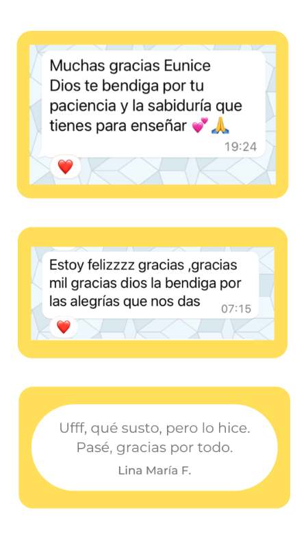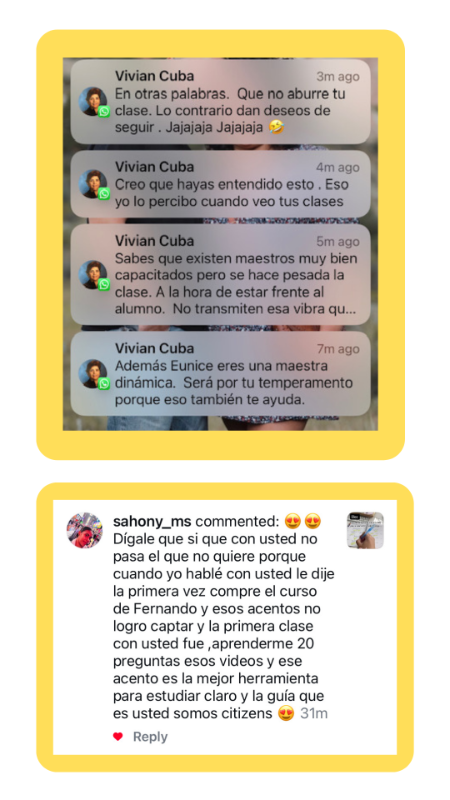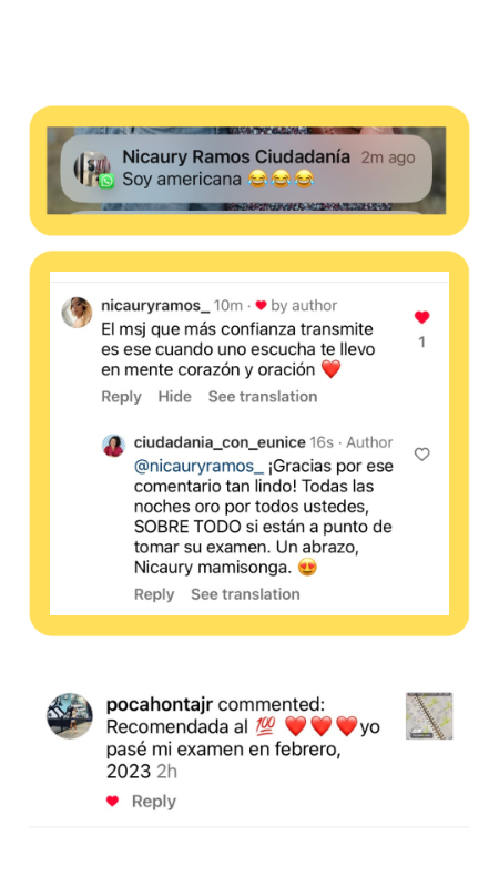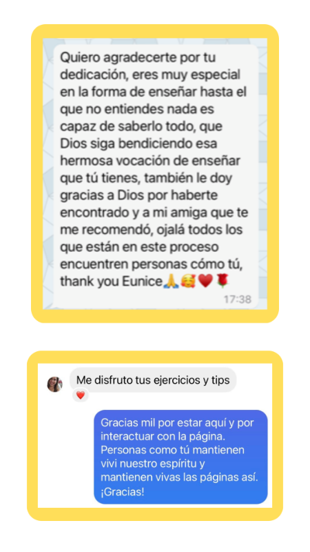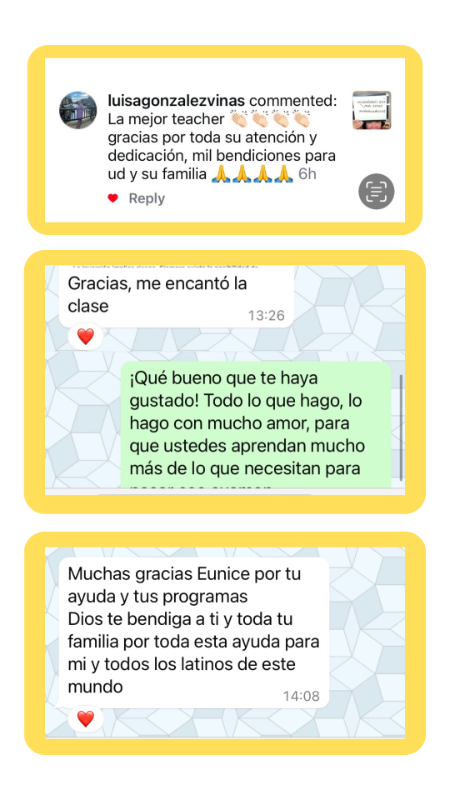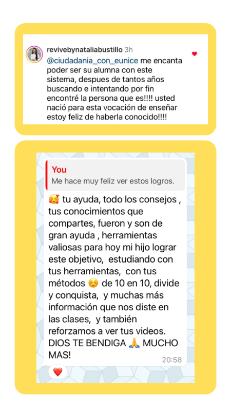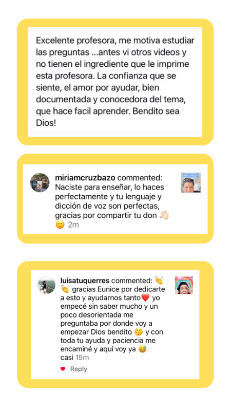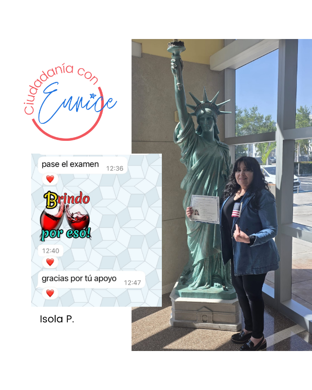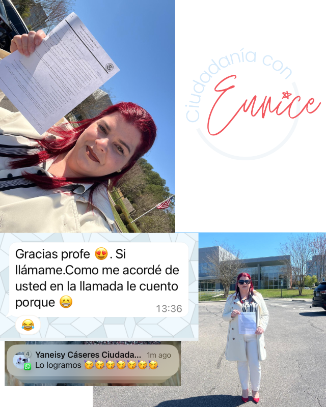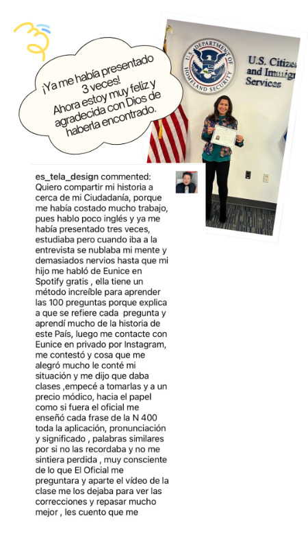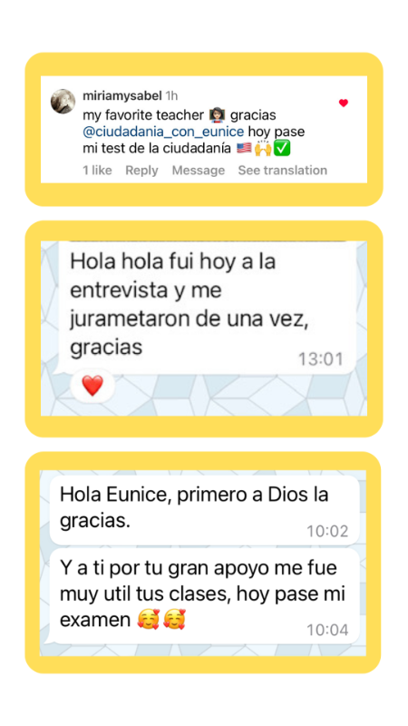 En este curso encontrarás todo lo que necesitas y mucho más: apoyo de la maestra Eunice, video-tutoriales, explicaciones simples y sencillas y ejercicios de práctica. Al adquirirlo también tienes derecho a UN SIMULADOR de ½ hora con la maestra Eunice. Durante el simulador, la maestra Eunice se hace pasar por la Oficial de inmigración y te evalúa y te da consejos para que mejores tus respuestas ANTES de presentarte a tu examen.